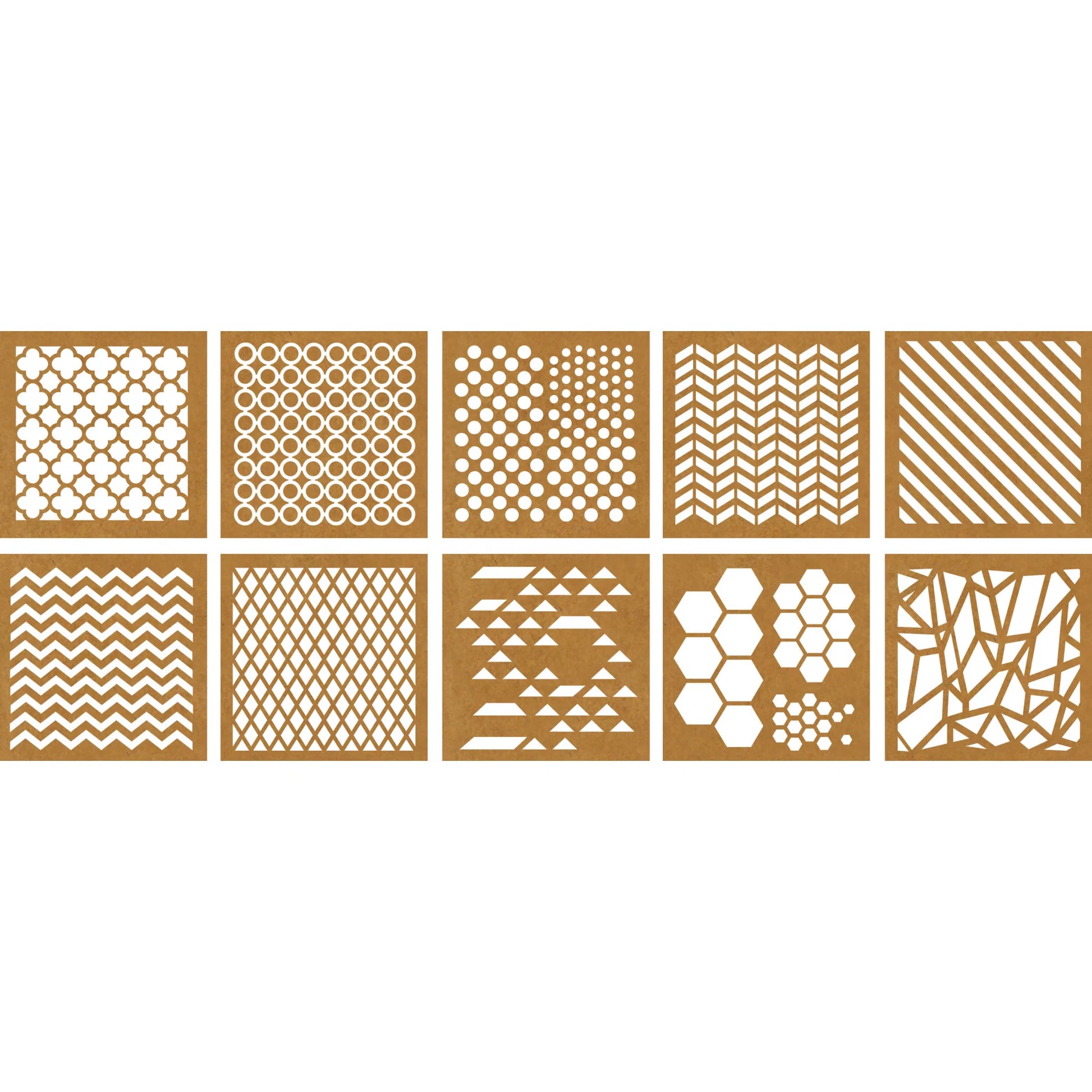- 10 PAPER STENCILS - Create mixed media art with laser cut paper stencils. This set consists of 10 6.5"x 6.5" paper stencils with classic geometric designs